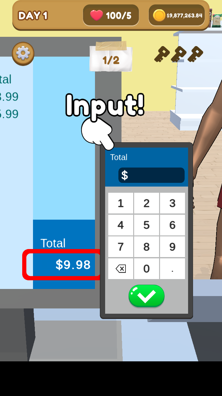 1、進(jìn)入游戲后,扮演收銀員角色,顧客會帶著商品來到收銀臺,點(diǎn)擊顧客進(jìn)行互動。
