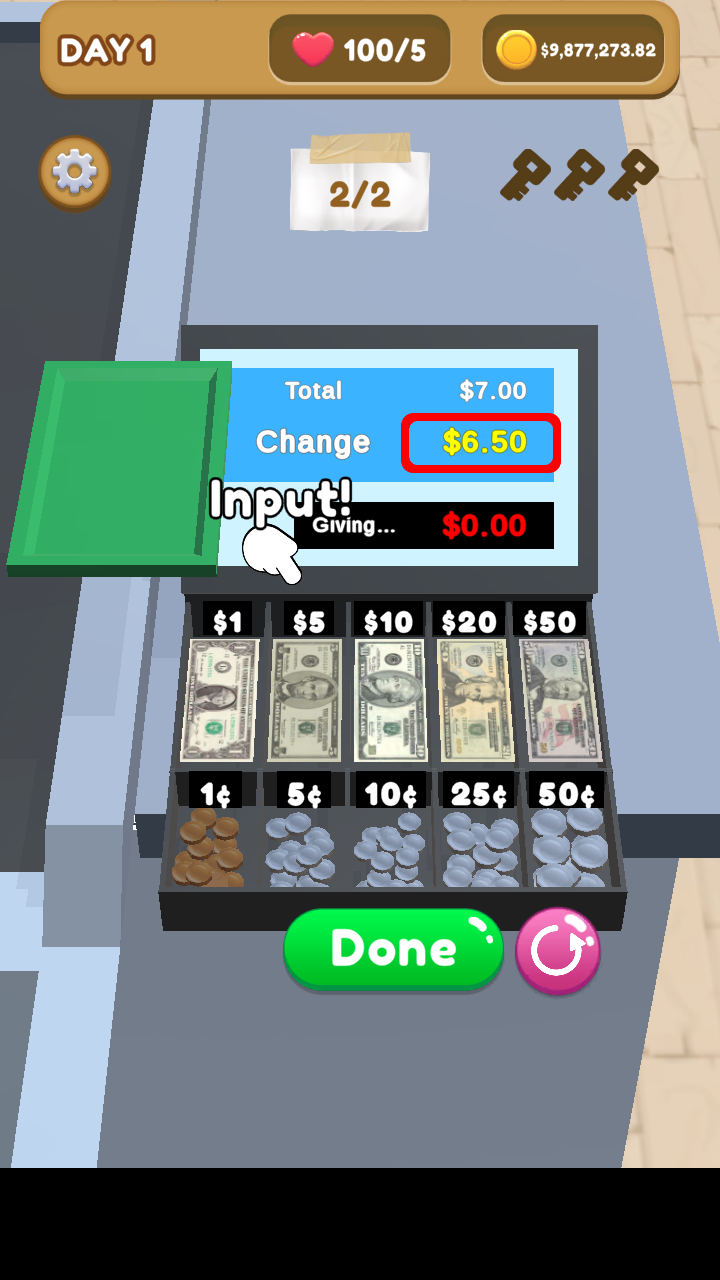 3、顧客付款后,根據(jù)應(yīng)找零金額,從收銀抽屜中選取對應(yīng)面值的貨幣組合,完成找零,點(diǎn)擊“Done”按鈕完成交易。