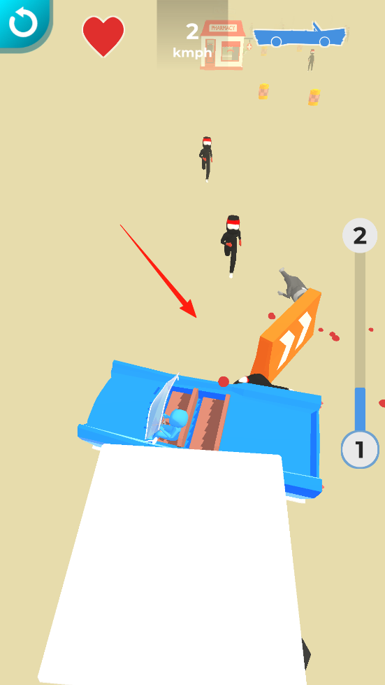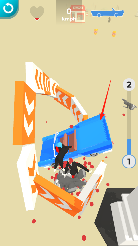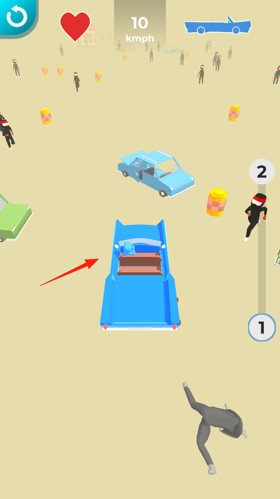2、駕駛中加速(2kmph),沖向斜坡并騰空,借物理彈射機制,飛躍時撞擊路上敵人,感受空中撞擊的爽快感,利用地形和速度拓展戰(zhàn)斗玩法。