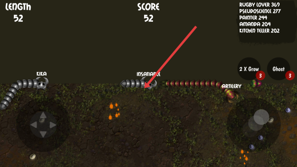 3、第三張是游戲?qū)?zhàn)界面,顯示“LENGTH52”(長度52)、“SCORE52”(分?jǐn)?shù)52),有多條蛇(如“KIKA”“INSATIABLE”“ARTILLERY”)。