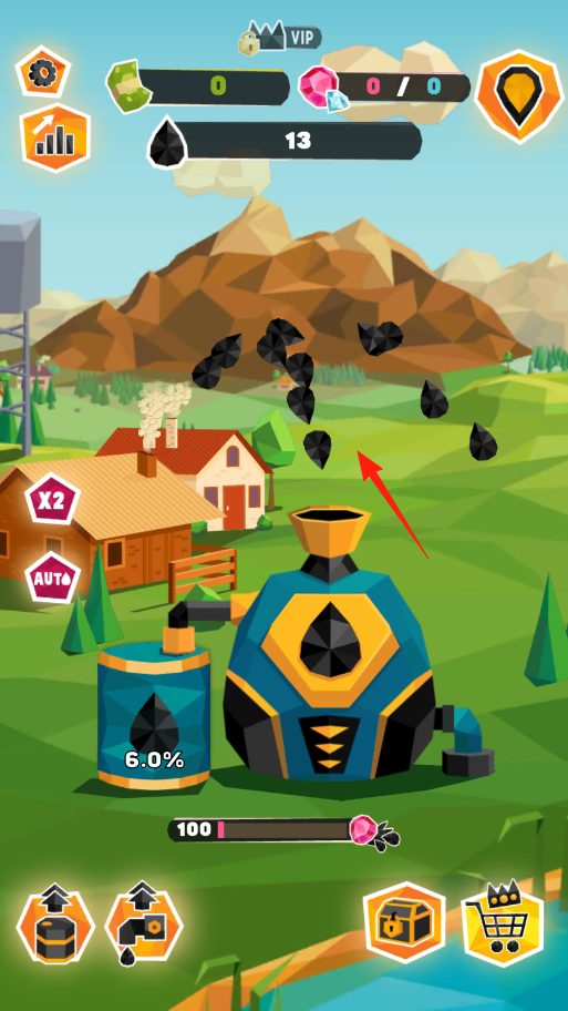 1、點(diǎn)擊畫面中藍(lán)色油泵(箭頭指向),開始抽取石油,儲(chǔ)存到上方石油資源欄(從0變?yōu)?3,再到10)。