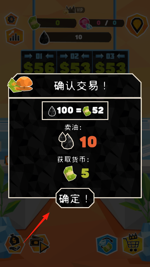 3、進(jìn)入交易界面,顯示100石油=52貨幣,點(diǎn)擊確定按鈕(箭頭指向),賣出10石油,獲取5貨幣,積累資金升級設(shè)備。