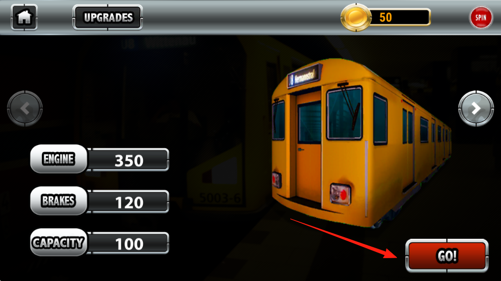 1、在火車屬性界面,確認(rèn)引擎(350)、剎車(120)、容量(100)參數(shù),點(diǎn)擊“GO!”按鈕(箭頭指向),進(jìn)入車站場(chǎng)景。