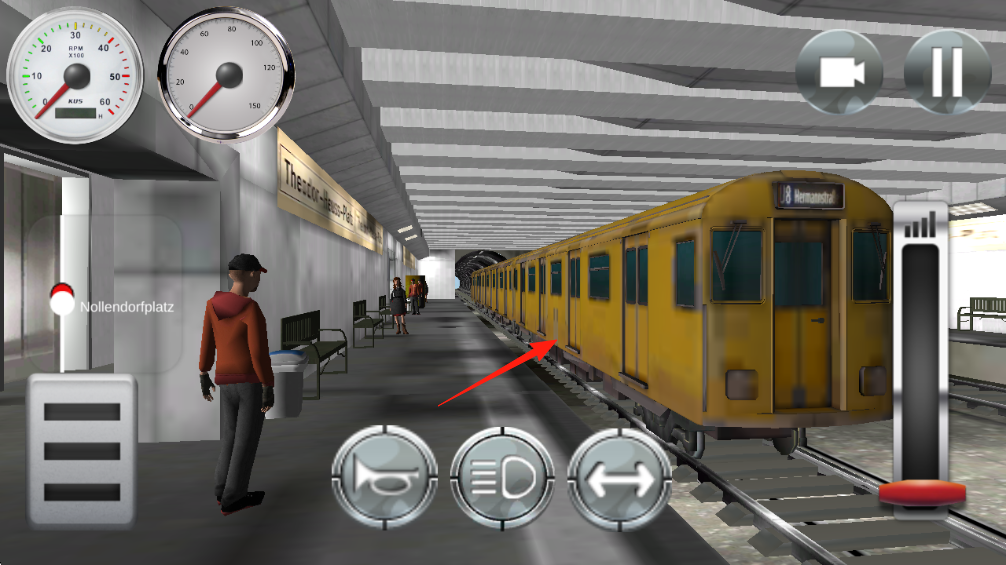 2、操控火車(箭頭指向黃色列車),在車站精準(zhǔn)???,等待乘客上下車,關(guān)注儀表盤與操作按鈕。