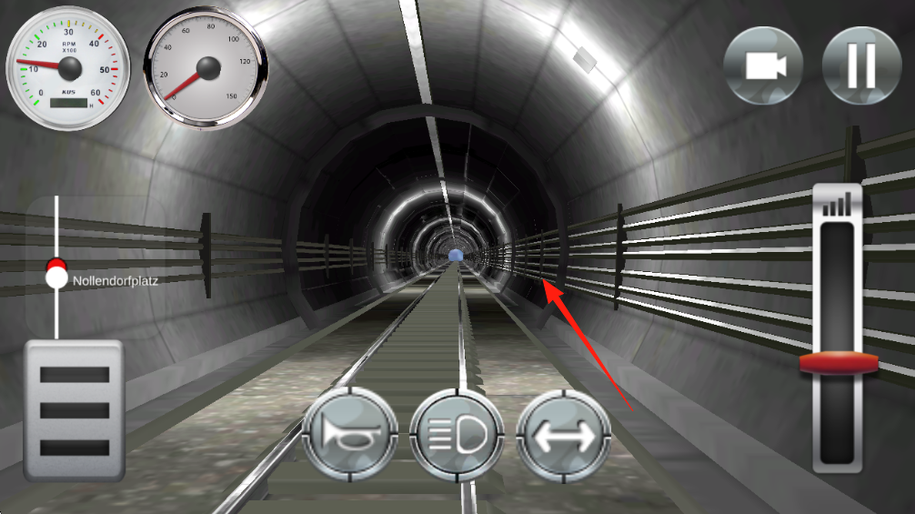 3、發(fā)車后,沿軌道進(jìn)入隧道(箭頭指向),通過右側(cè)拉桿控制速度,左側(cè)按鈕切換功能,平穩(wěn)駕駛完成行程。
