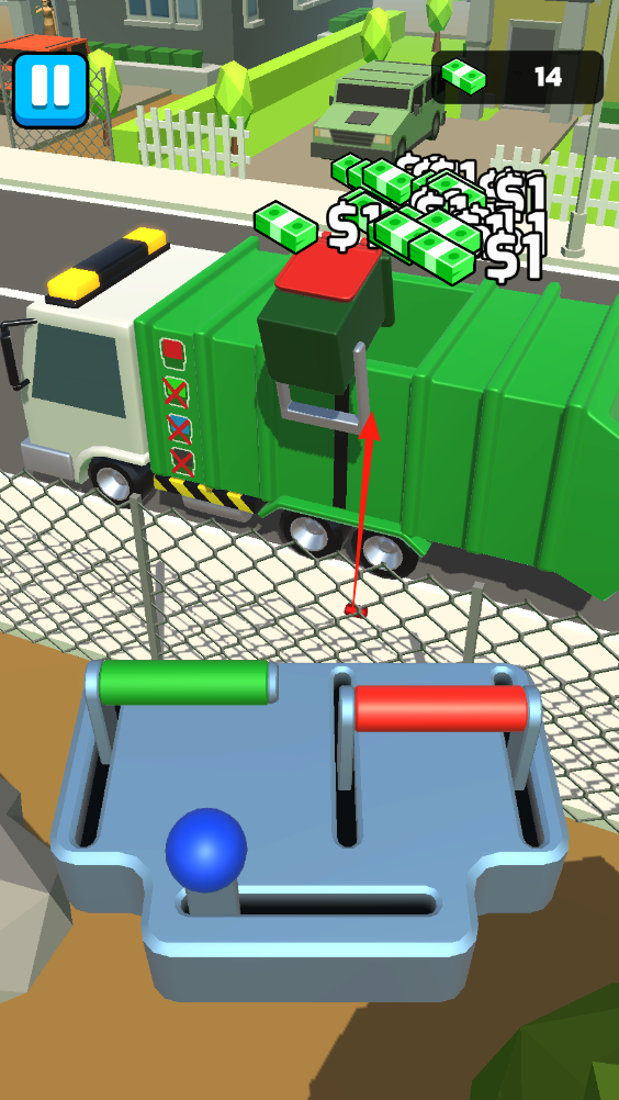 3、成功倒垃圾后,獲得金幣(如14),可用于升級設(shè)備、解鎖新區(qū)域,繼續(xù)回收任務(wù)。