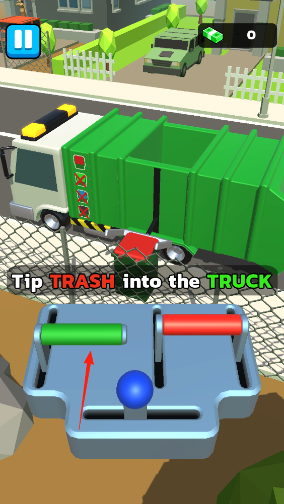 1、進(jìn)入游戲后會看見綠色垃圾車,并且提示“TipTRASHintotheTRUCK”,操作下方搖桿(藍(lán)色球)、拉桿(綠色、紅色),對準(zhǔn)紅色垃圾桶。