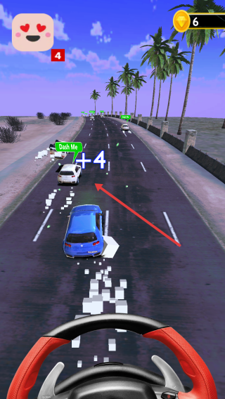 2、撞擊白色方塊獲取【+4】分?jǐn)?shù),突破藍(lán)色車輛阻攔,繼續(xù)沿道路前進(jìn)。