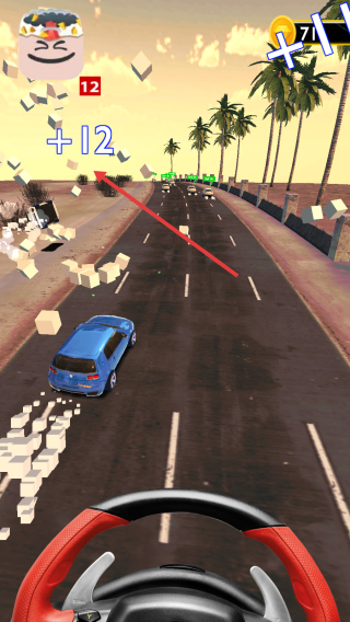 3、持續(xù)撞擊障礙累加分?jǐn)?shù)(如【+12】),保持速度,超越更多前方車輛,積累積分。