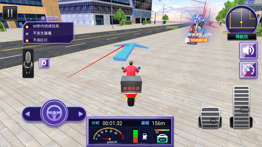 1、進(jìn)入游戲后,選擇初始交通工具摩托車,查看訂單地址與路線,根據(jù)提示學(xué)習(xí)如何控制車輛啟動(dòng)、轉(zhuǎn)向。