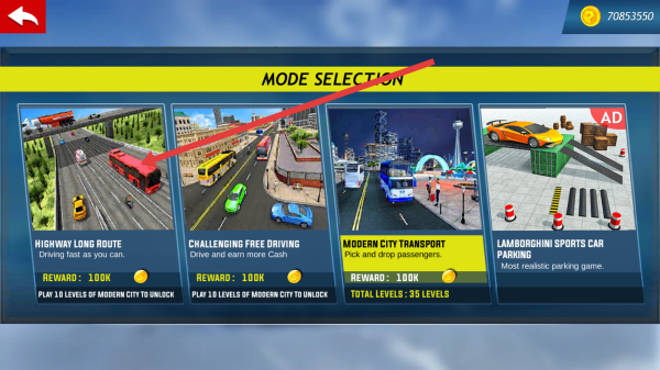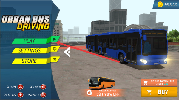 1、進入到游戲里,在Urban-Bus-Driving主界面,點擊PLAY,進入模式選擇,開啟巴士駕駛挑戰(zhàn)。