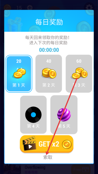 1、進(jìn)入每日獎(jiǎng)勵(lì)頁,點(diǎn)擊索取,領(lǐng)取第1天20金幣,或看廣告雙倍獲取,積累游戲資源。