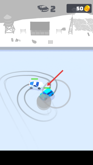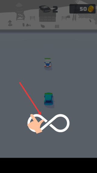 1、滑動屏幕按∞軌跡,操控藍色汽車漂移,靠近白色車輛完成互動如追逐、對抗。