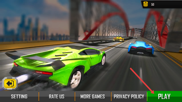 1、點擊PLAY進入賽車游戲,選賽道開始競速,操控黃色汽車在路面行駛,避障礙、超對手。