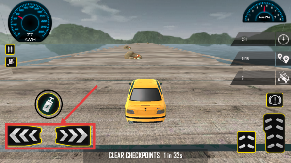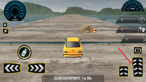 2、用右側(cè)按鍵控剎車、油門,左側(cè)按鍵調(diào)方向,在限時如38s內(nèi)通過checkpoint。