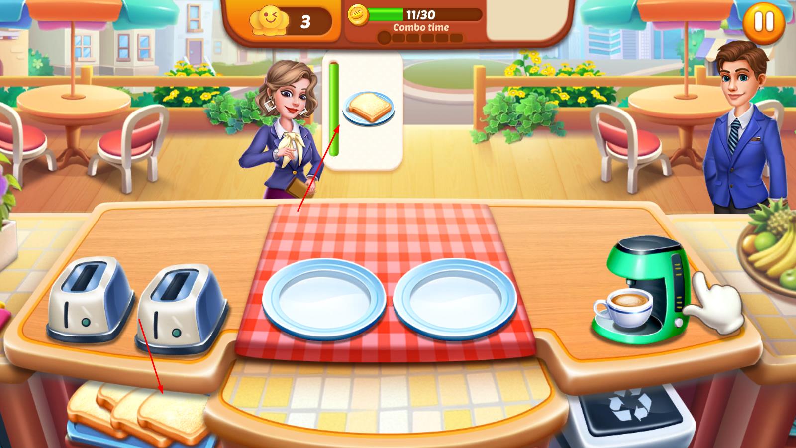 3、不斷解鎖新菜譜、廚房設(shè)備,合理安排資源與時間,提升餐廳盈利能力,從新手廚師逐步晉升為料理達(dá)人,實現(xiàn)經(jīng)營逆襲。