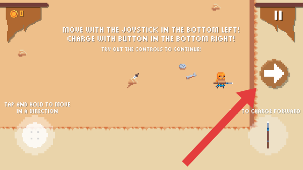 2、文字提示玩家用左下角虛擬搖桿移動(dòng),右下角按鈕沖刺,讓玩家熟悉操作繼續(xù)游戲,呈現(xiàn)像素風(fēng)格的教學(xué)場(chǎng)景。