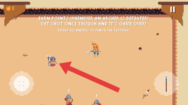 3、文字提示擊敗弓箭手可得分,被射中一次則游戲結(jié)束,擊敗所有敵人完成教程,呈現(xiàn)像素風(fēng)格的戰(zhàn)斗教學(xué)場(chǎng)景,引導(dǎo)玩家熟悉戰(zhàn)斗規(guī)則。