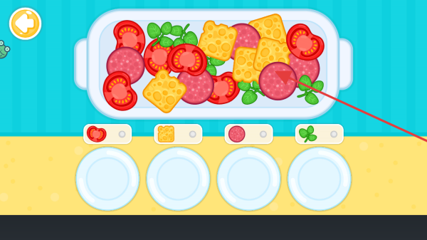 3、在食材準備界面,按照提示將西紅柿、奶酪、香腸、羅勒葉等食材放置到對應(yīng)盤子中,完成比薩食材準備,推進比薩制作流程。
