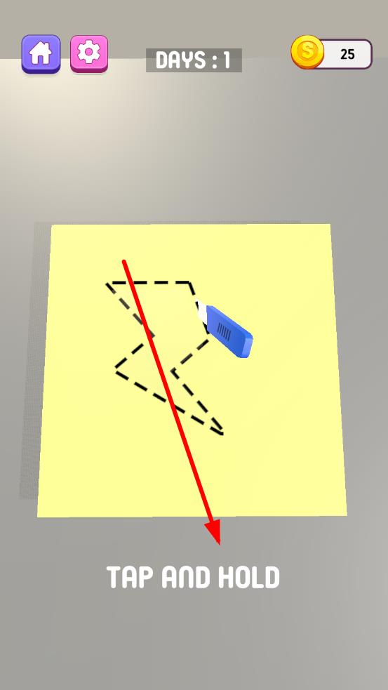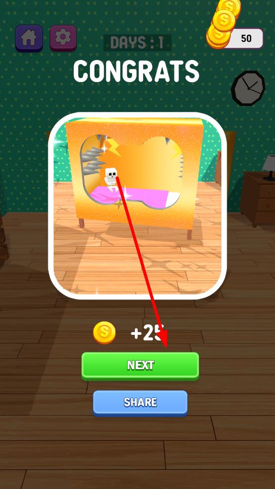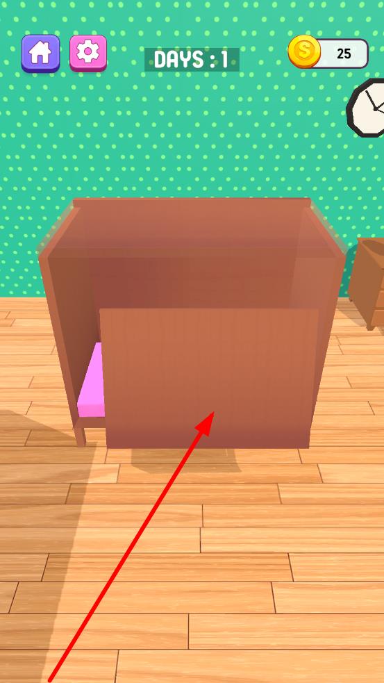 1、在初始房間界面,根據(jù)提示,點擊發(fā)光的黃色物品,觸發(fā)裝修任務(wù)。查看頂部“DAYS:1”了解天數(shù)進(jìn)度。