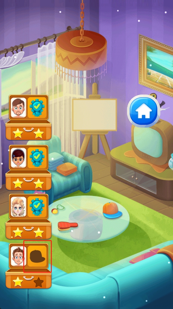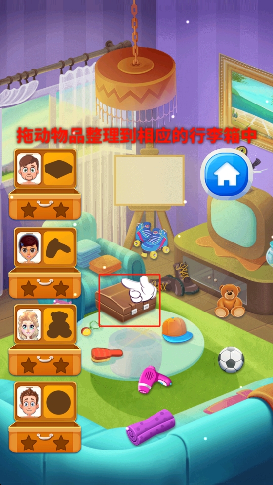 1、首先我們依據(jù)提示把左側(cè)行李箱對應(yīng)物品圖案找到,再將客廳里的物品拖入匹配的行李箱,按指引操作完成分類。