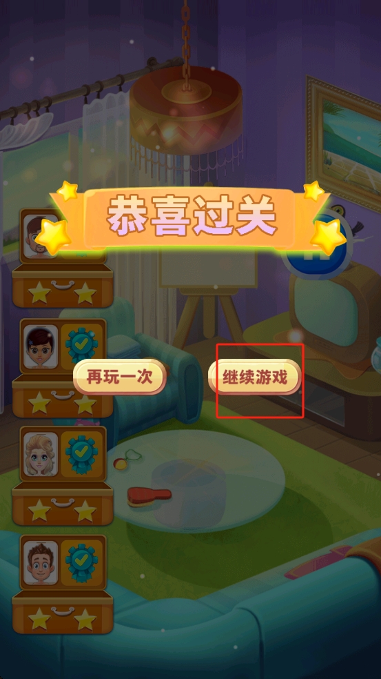 3、過關(guān)后可以點(diǎn)擊繼續(xù)游戲進(jìn)入下一關(guān)挑戰(zhàn),或者選擇再玩一次按鈕,重新整理下過關(guān)的思路。