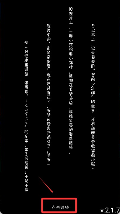 1、進入游戲后會有一段文字介紹,點擊屏幕空白區(qū)域繼續(xù)。