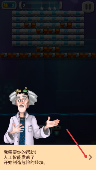 1、關(guān)卡開始,點擊箭頭推進劇情,了解人工智能制造危險磚塊的背景,進入挑戰(zhàn)。