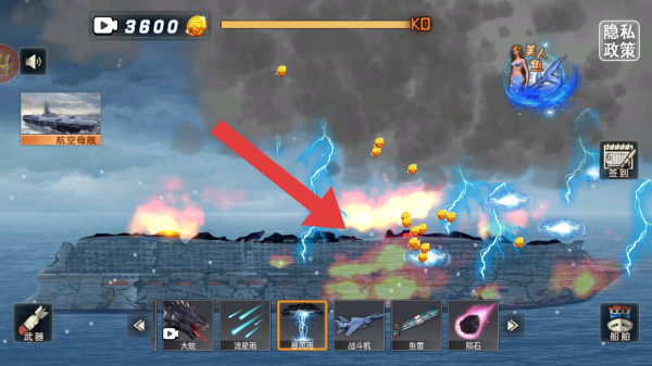 3、將船只摧毀后能夠獲得3600金幣數(shù),呈現(xiàn)了艦船被攻擊、釋放技能的戰(zhàn)斗場景畫面。