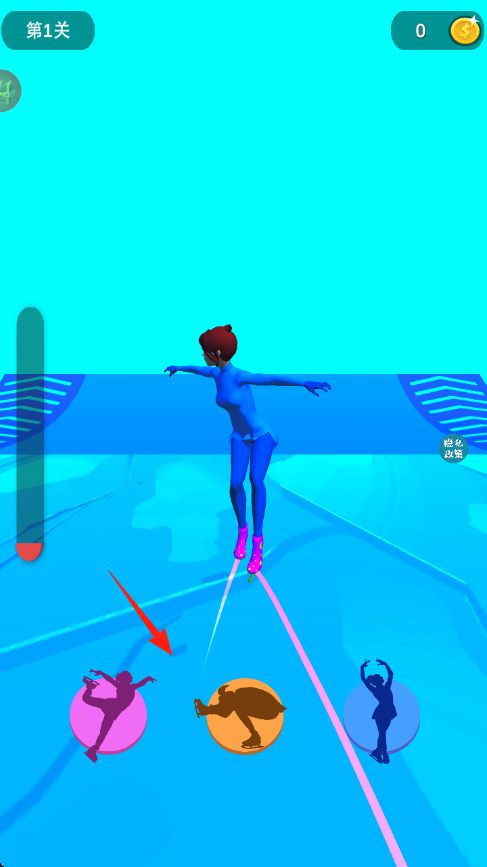 2、按箭頭指向,點擊粉色動作圖標(biāo),切換滑冰姿勢,可能改變速度或得分。