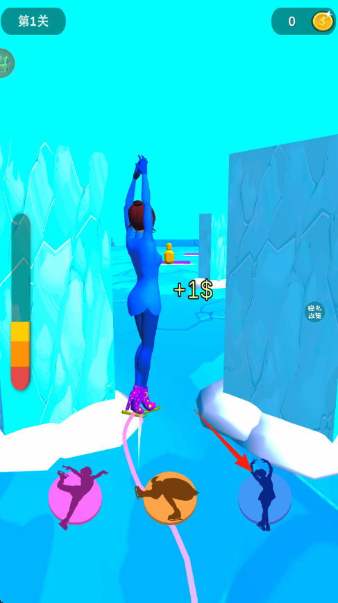 3、點擊藍(lán)色動作圖片,箭頭指向,變換動作,通過冰面障礙,收集金幣+1$,完成第1關(guān)。