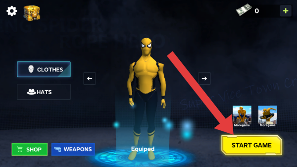 1、用于自定義角色外觀和裝備,點(diǎn)擊STARTGAME,可進(jìn)入游戲;還有貨幣顯示及加號(hào)按鈕用于增加貨幣。