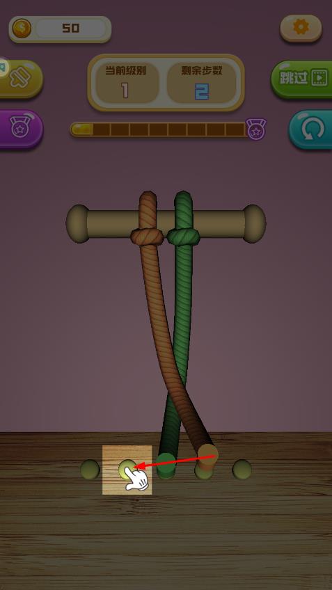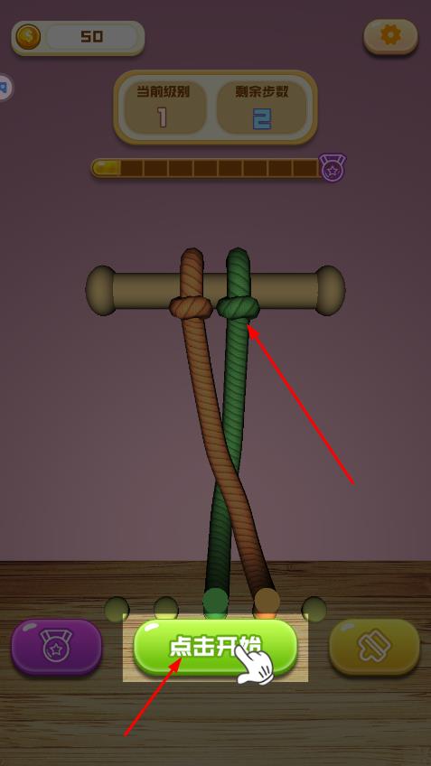 1、點擊開始,觀察交叉繩索與底部卡扣,規(guī)劃移動步驟,剩余步數(shù)2。