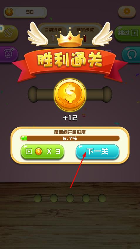 3、成功解開所有繩索,顯示勝利通關(guān),獲金幣獎勵,點擊下一關(guān),挑戰(zhàn)更復(fù)雜繩結(jié)。
