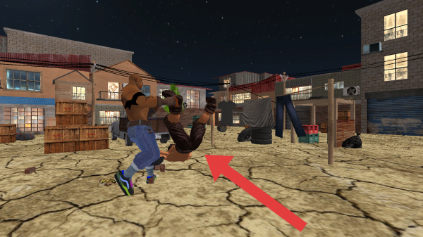 3、呈現(xiàn)兩個(gè)角色在戶(hù)外場(chǎng)景荒地、有建筑物對(duì)戰(zhàn),一個(gè)角色將另一個(gè)角色舉起,紅色箭頭指向被舉起的角色。
