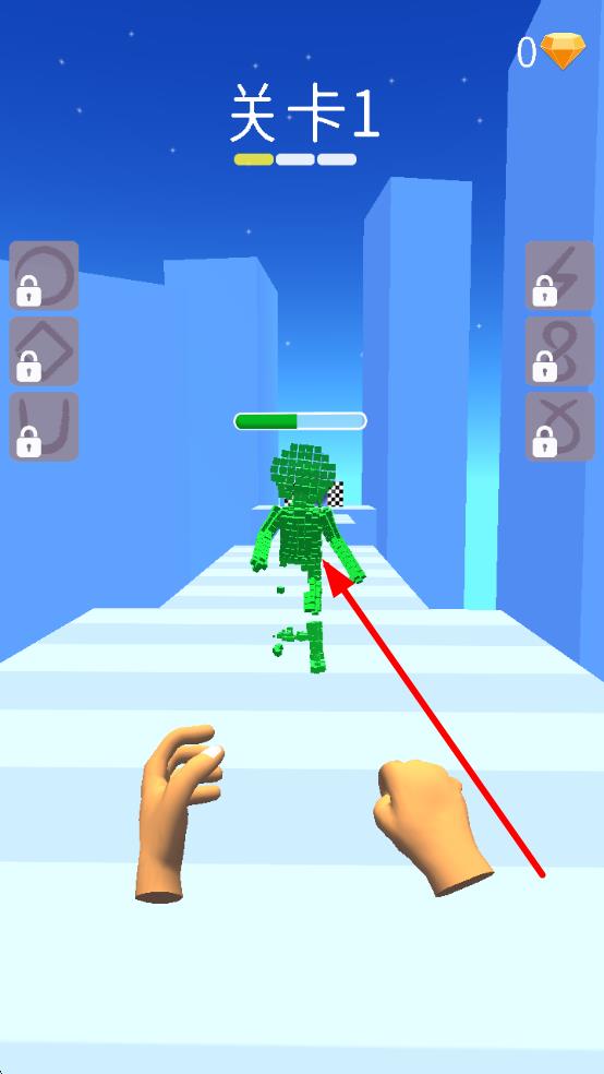 1、進入關(guān)卡,操控綠色角色,沿通道前行,躲避障礙。