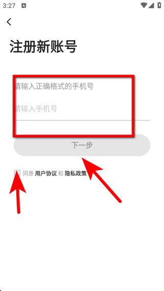4、輸入手機(jī)號(hào)并勾選同意協(xié)議,點(diǎn)擊下一步,即可完成賬號(hào)注冊(cè)操作。