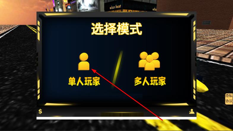1、在模式選擇界面,選單人玩家,進入賽車競速,操控賽車在城市賽道行駛。