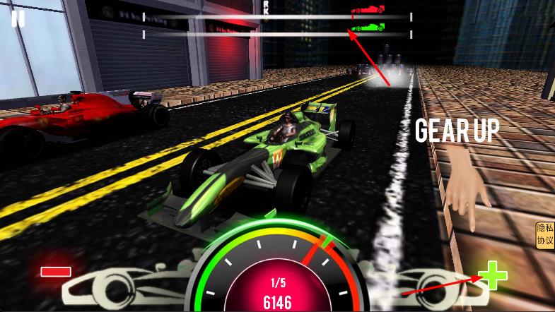 2、比賽中,按GEAR UP提示換擋點擊+號按鈕,提升速度,超越對手,緊盯小地圖。