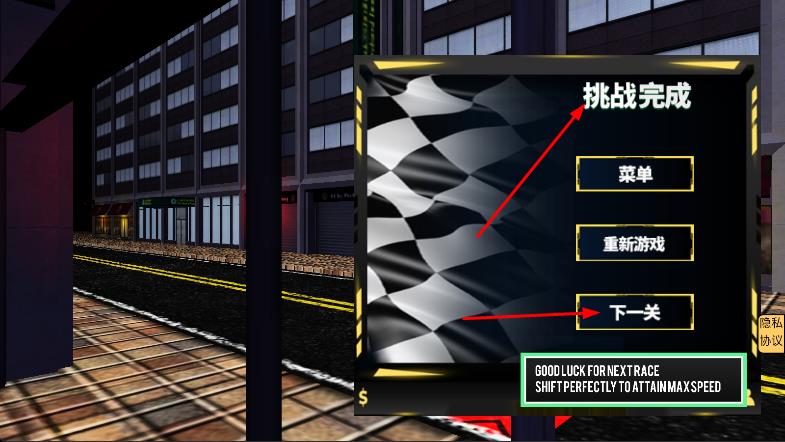 3、沖過終點,完成挑戰(zhàn),獲獎勵,點擊下一關解鎖新賽道、賽車,繼續(xù)競速對決。