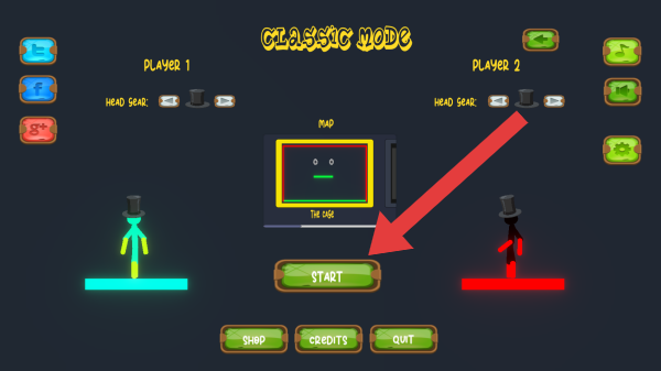 2、模式名稱PLAYER1、PLAYER2標(biāo)識,可點擊中間START開始的按鈕,下方SHOP、CREDITS、QUIT按鈕,還有左右兩側(cè)的功能圖標(biāo)。