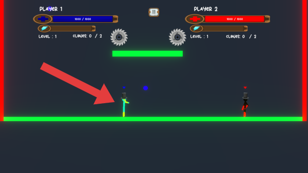3、雙方血量均為100/100、等級LEVEL:1、克隆體數(shù)量CLONES0/2,場景中有鋸片、平臺等元素,呈現(xiàn)出兩人對戰(zhàn)的游戲狀態(tài)。