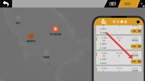2、在打工模式訂單列表中,選擇標(biāo)有+300收益的訂單接取,依據(jù)訂單信息開啟載客的任務(wù)。
