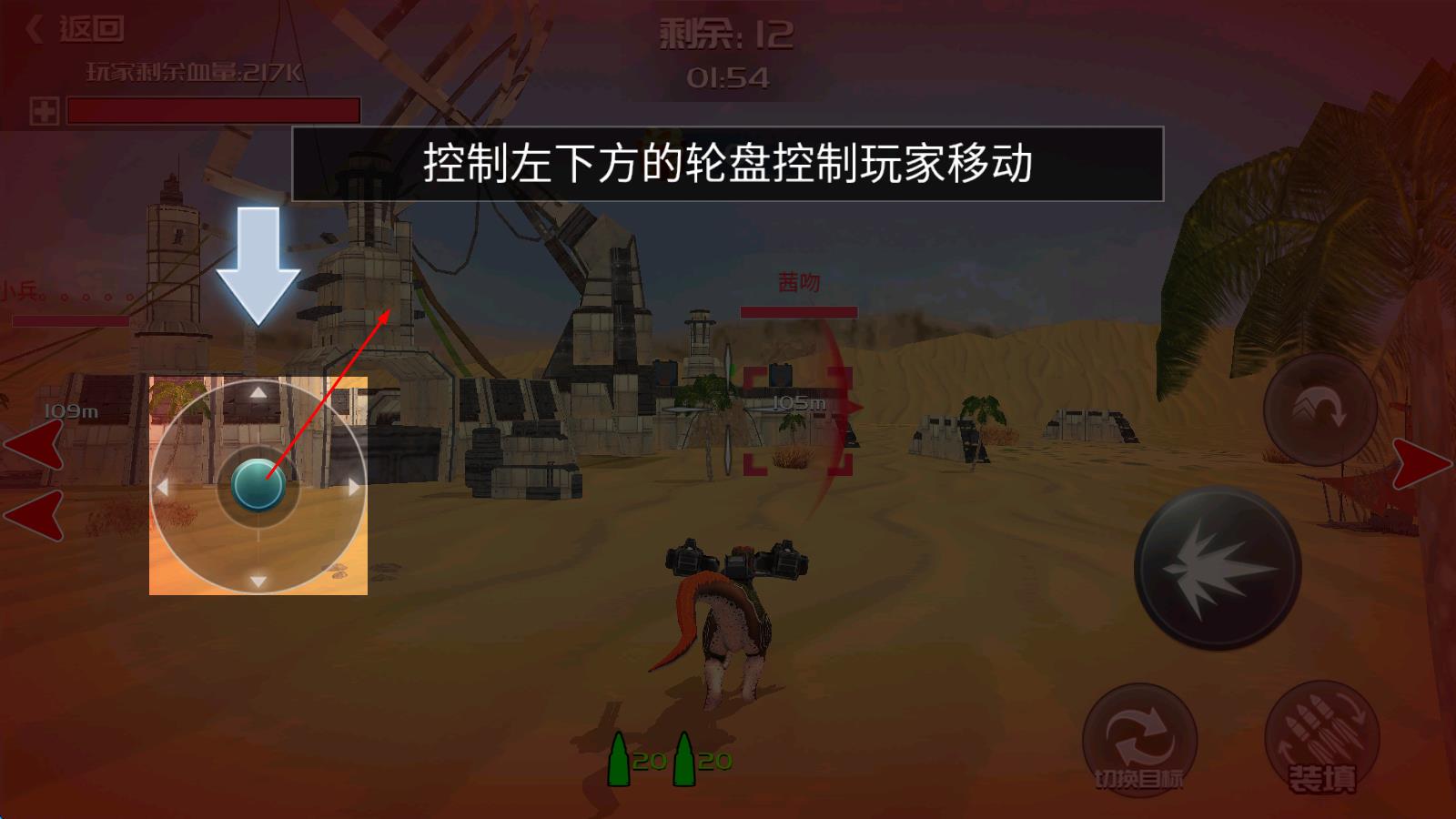 1、打開游戲,在首頁(yè)選擇心儀模式點(diǎn)擊對(duì)戰(zhàn),選定出戰(zhàn)恐龍后進(jìn)入戰(zhàn)場(chǎng),用左下方輪盤控制移動(dòng),右滑屏幕調(diào)整視角,開啟戰(zhàn)斗之旅。
