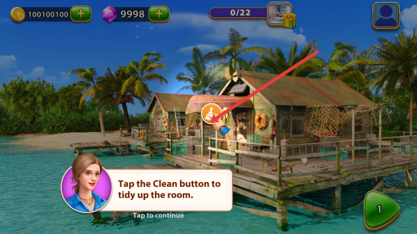 1、按指引點(diǎn)Clean按鈕清潔房屋,完成初始任務(wù),拿金幣、道具獎勵,熟悉操作。