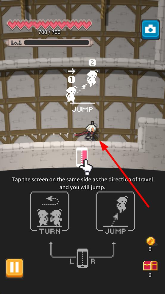 2、進(jìn)入教程關(guān)卡中,點(diǎn)擊屏幕使角色跳躍,箭頭指向角色,跨越障礙前行。