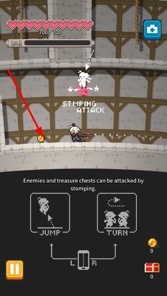 3、遇到敵人或?qū)毾?,通過跳躍踩踏,指向金幣,可嘗試攻擊獲取,開啟寶箱。