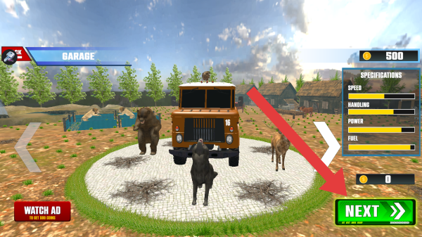 1、GARAGE車庫、車輛、動物,點擊下方NEXT綠色按鈕,場景中有車輛、熊、狼等動物,背景有樹木、房屋等。