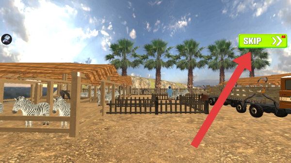 2、涉及動物運輸題材,畫面中有斑馬等動物被圈養(yǎng)在圍欄里,還有車輛,右上角有綠色的SKIP跳過按鈕,玩家可選擇跳過當前環(huán)節(jié)。