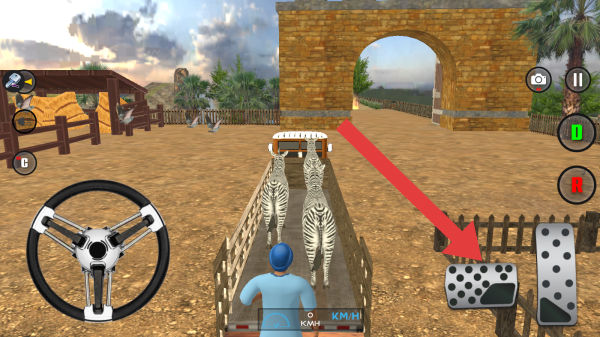3、駕駛視角、方向盤、踏板等操作控件,運輸?shù)陌唏R,以及場景中的建筑、樹木、圍欄等,看出是動物運輸模擬類,玩家需操控車輛完成運輸任務。